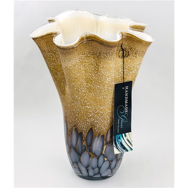 #9016 - NEW WITH TAG, BEAUTIFULLY CRAFTED VASE FROM POLAND, RUFFLED TOP EDGE DESIGN, MEASURES 13” (33 CM) TALL, 10” (25.5 CM) WIDE