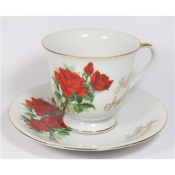 HAPPY ANNIVERSARY TEA CUP AND SAUCER ROSE PATTERN1517 - HAPPY ANNIVERSARY TEA CUP AND SAUCER ROSE PATTERN