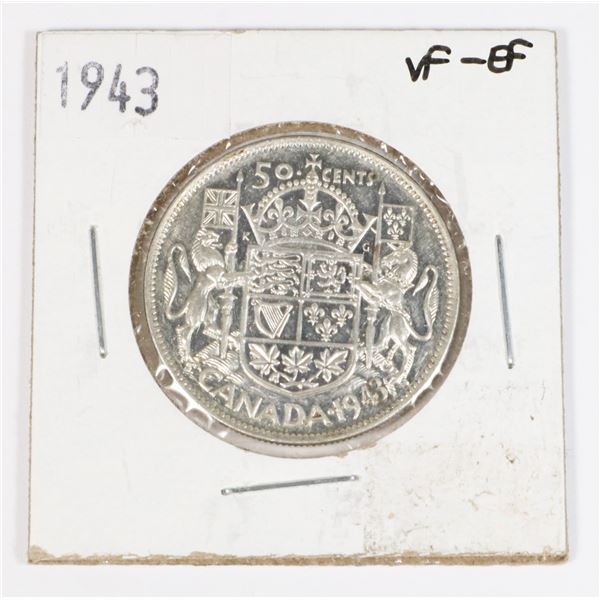 1943 CANADA HALF DOLLAR (VF-EF) .3-OZ SILVER **ITEM(S) LOCATED IN LETHBRIDGE ALBERTA. ALL ITEMS IN THIS AUCTION ARE ELIGIBLE FOR FREE TRANSPORT TO ED