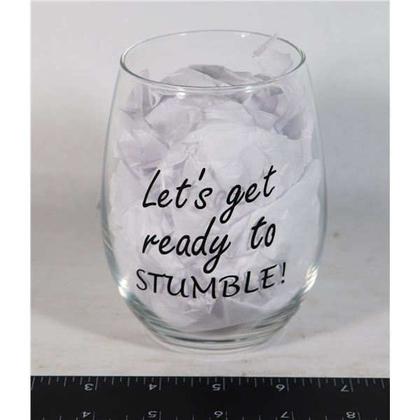 NEW WINE GLASS. "LET'S GET READY TO STUMBLE!" ***ITEM(S) LOCATED IN LETHBRIDGE ALBERTA. TRANSPORT TO EDMONTON FEE STRUCTURE IS POSTED...