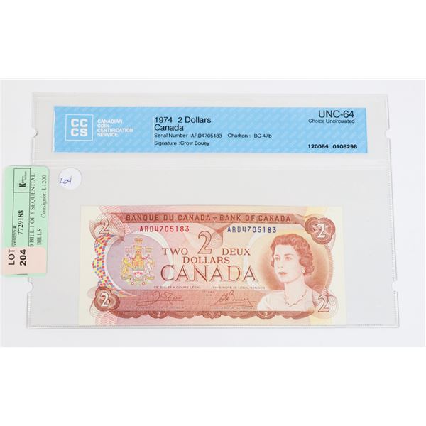 1974 $2.00 BILL 1 OF 6 SEQUENTIAL GRADED BILLS