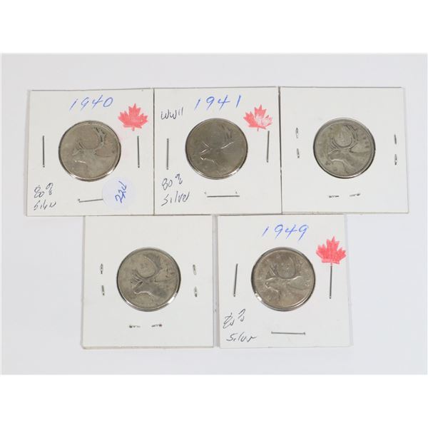 5 SILVER QUARTERS 1940, 1941, 1942, 1943 & 1949