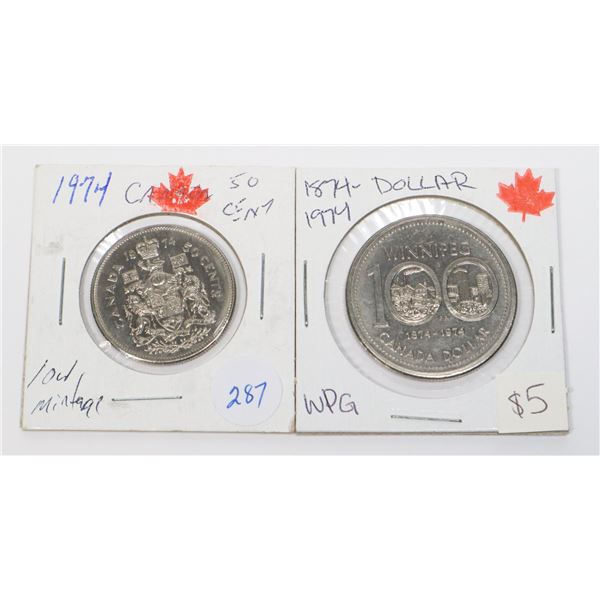 1874-1974 WINNIPEG CENTENNIAL DOLLAR & 50 CENT