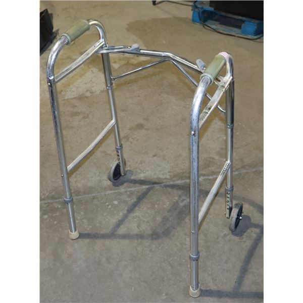 ADJUSTABLE HEIGHT WALKER (TWO LEGS, TWO WHEELS) ***ITEM(S) LOCATED IN LETHBRIDGE ALBERTA. WORLDWIDE SHIPPING AVAILABLE. TRANSPORT TO OUR EDMONTON OFF