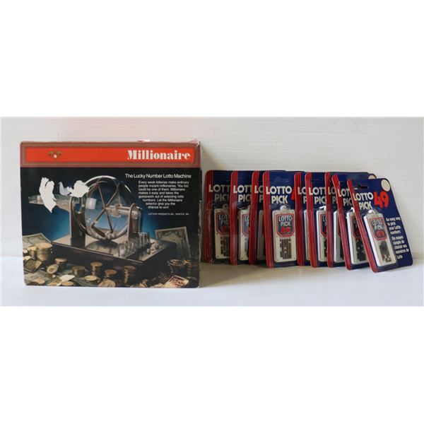 THE LUCKY NUMBER LOTTO MACHINE MOTORIZED (NEW IN BOX) W/SEALED 8 LOTTO PICK 49 KEYCHAINS