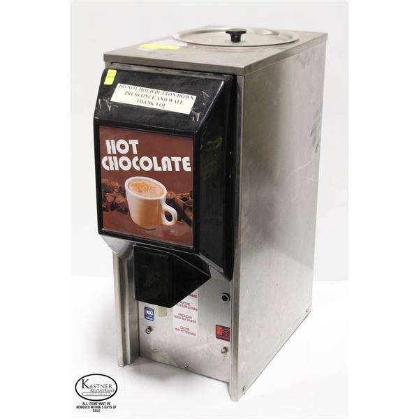 HOT CHOCOLATE DISPENSER, 120V. **ALL ITEMS MUST BE REMOVED BY 5PM MONDAY, SEPTEMBER 12TH, 2022. ALL REMAINING ITEMS WILL BE SUBJECT TO A $6.00 PER DAY