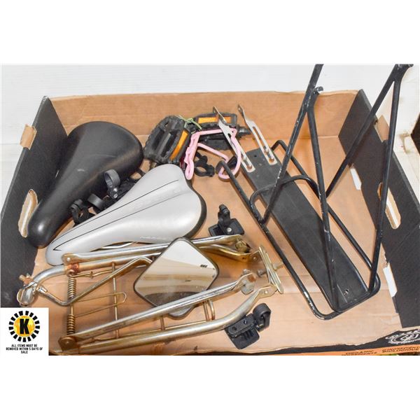 LOT OF BIKE PARTS, SEATS, RACKS, REFLECTORS ETC
