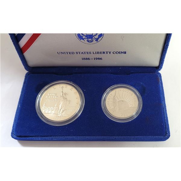 ORIGINAL VELVET BOX, FROM 1986, 2 COIN STATUE OF LIBERTY PROOF SET, DOLLAR CONTAINS 77% PURE SILVER. CURRENCY