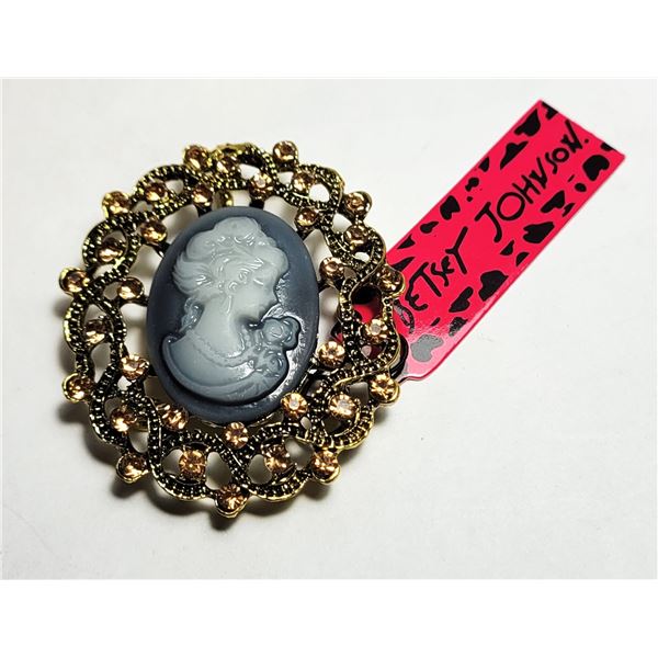 28) GOLD TONE WITH CRYSTALS GREY CAMEO BROOCH/