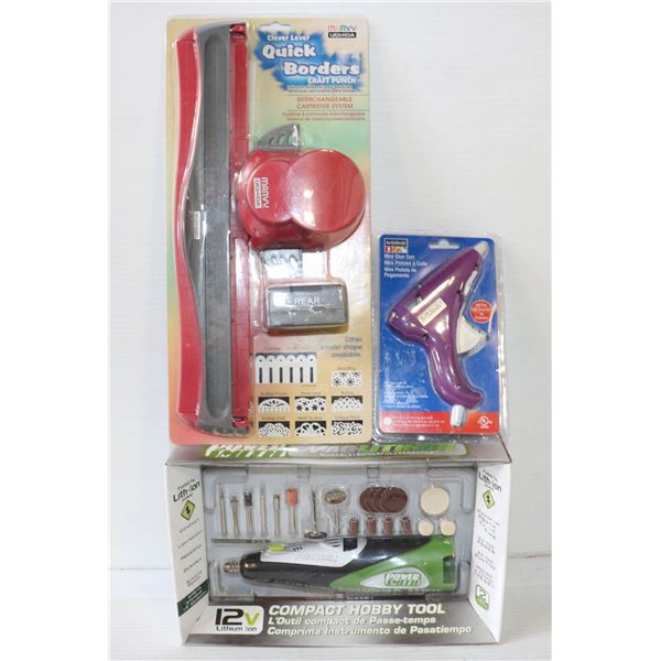 12 VOLT COMPACT HOBBY TOOL 20 ACESSORIES W/CLEVER LEVER QUICK BORDERS CRAFT PUNCH & MINI GLUE GUN