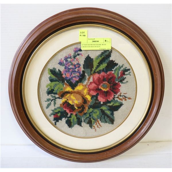 14" ROUND WOOD FRAME WITH CROSS STICHED DESIGN