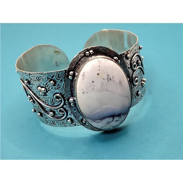 STAMPED 925 SILVER WITH A 1.5" LONG WHITE AND GREY OVAL DENDRITE OPAL. JEWELLERY