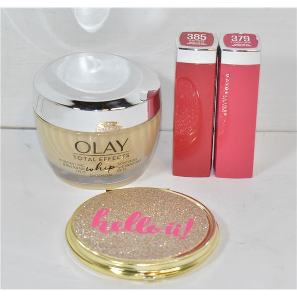 SUNSCREEN (50 ML) AND HELLO U! COMPACT MIRROR AND 2 MAYBELLINE LIPSTICKS - RUBY & FUCHSIA