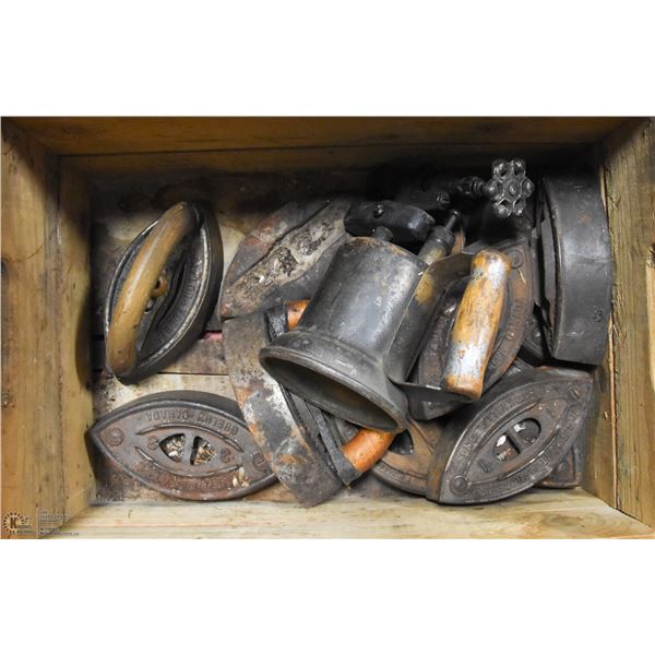 LOT OF ASSORTED ANTIQUE IRONS AND BLOW TORCH