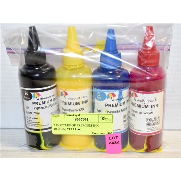 4 BOTTLES OF PREMIUM INK - BLACK, YELLOW,