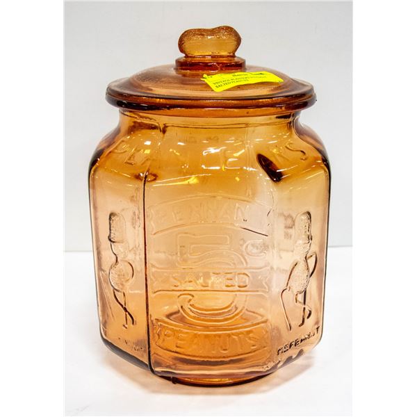 CLEAR DEPRESSION GLASS MR. PEANUT COUNTERTOP JAR WITH LID (12.5"H X 8"-OCTAGON) - NO CHIPS