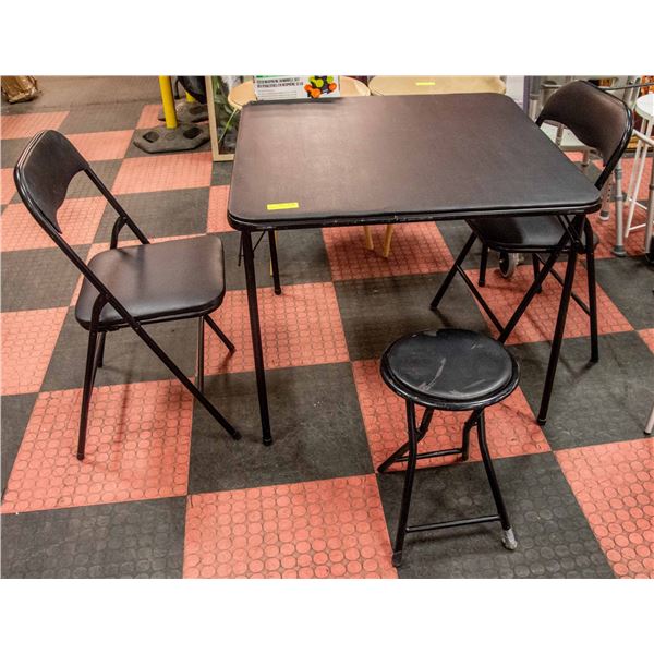 (34"L X 34"W X 30"H) WITH TWO FOLDABLE CHAIRS AND FOLDABLE ROUND STOOL - PADDED TABLETOP, PADDED SEATS AND BACKS ON CHAIRS