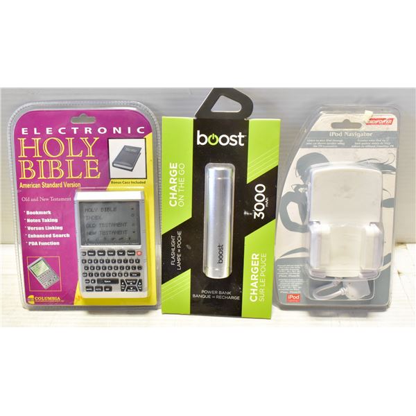 NAVIGATOR, BOOST CHARGE ON THE GO POWER BANK 3000 MAH & COLUMBIA ELECTRONIC HOLY BIBLE OLD & NEW TESTAMENT AMERICAN EB-1