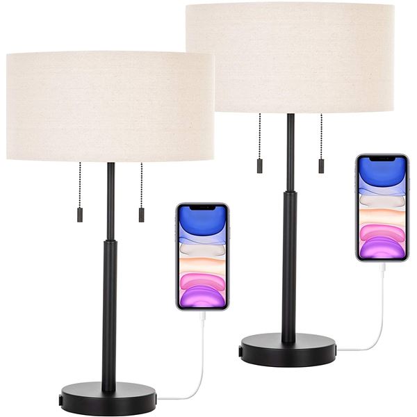 USB POWER OUTLET AND AC POWER OUTLET, DRUM LINEN COVERS, PULL CHAIN SWITCH, 120V, SET OF 2 LAMPS, ALL PARTS CONFIRMED, INSTRUCTION MANUAL INCLUDED,