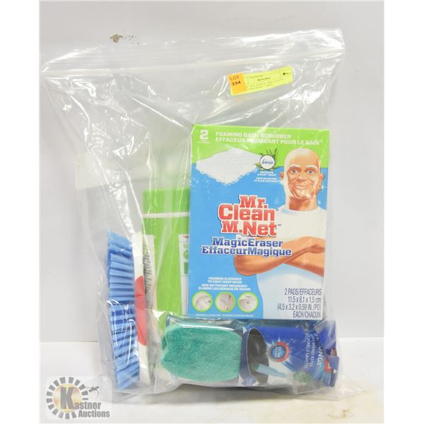 BAG W/ PET WIPES, MR CLEAN MAGIC ERASERS + MISC