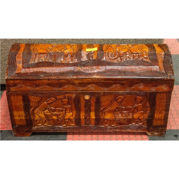 HEAVILY CARVED WOOD ASIAN HOPE CHEST TRUNK