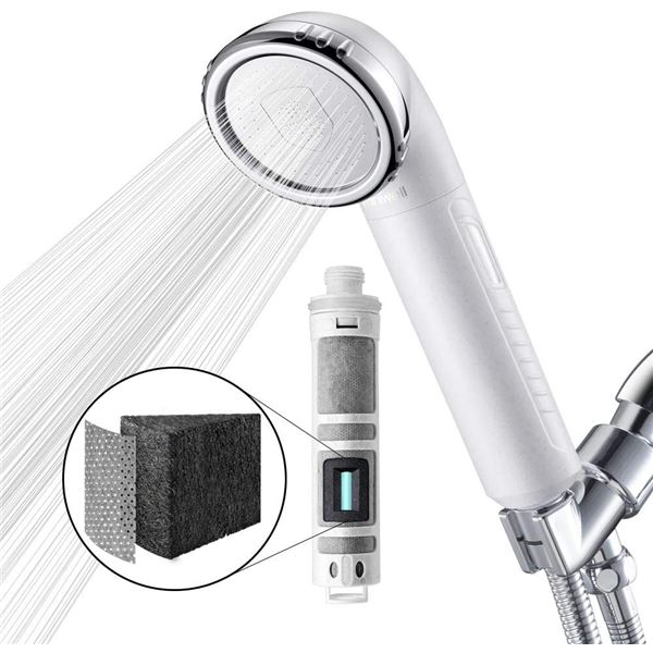 HARDWARE, BUILT IN FILTER THAT ELIMINATES 99% OF CHLORINE AND PARTICULATES IN THE WATER, WHITE MARBLE LIKE FINISH ON THE SHOWER HEAD, ALL PARTS CON