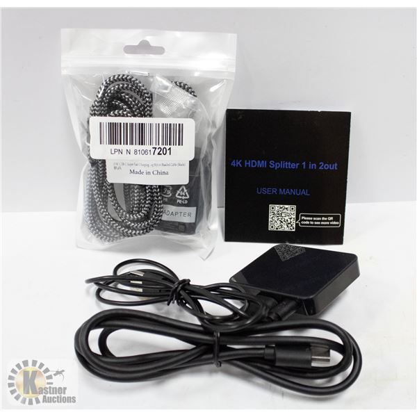 NEW LOT OF CORDS, 4K HDMI SPLITTER 1 IN 2 OUT AND