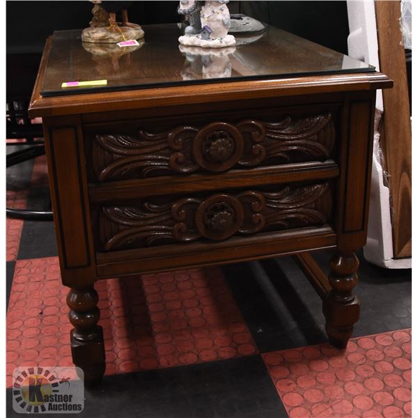 WOOD CARVED STYLE END TABLE W/GLASS TOP