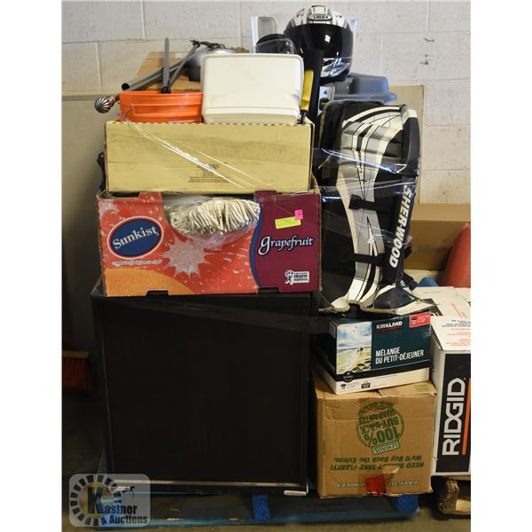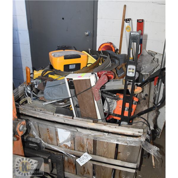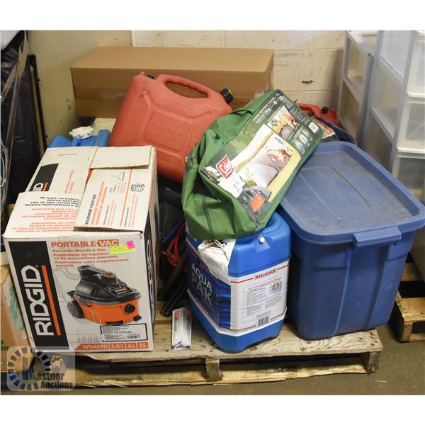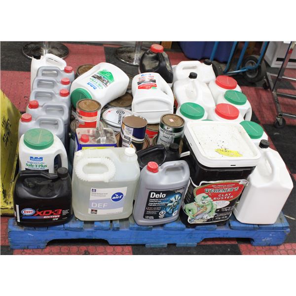PALLET OF ASSORTED JUGS & CANS INCLUDING ENGINE