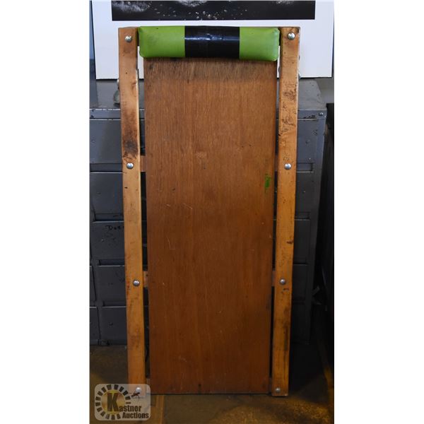 EXPERIENCED GARAGE CREEPER. WOOD. PADDED HEAD REST. 4 METAL SWIVEL WHEELS