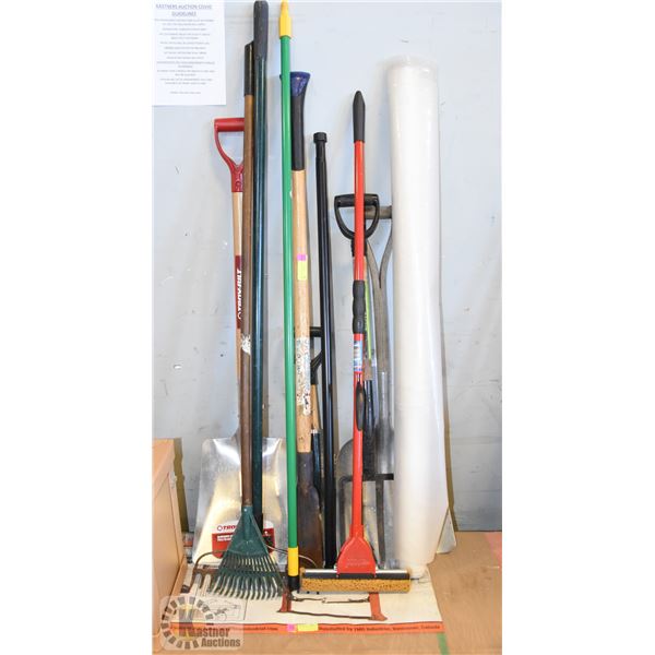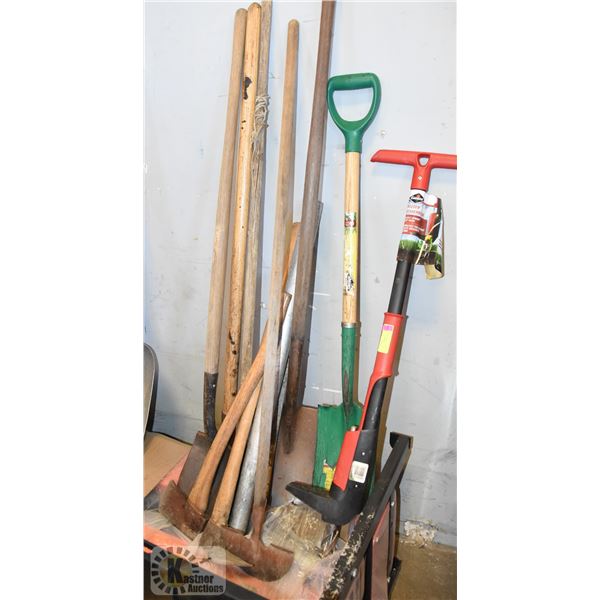 LOT OF ESTATE GARDENING TOOLS, SHOVELS,