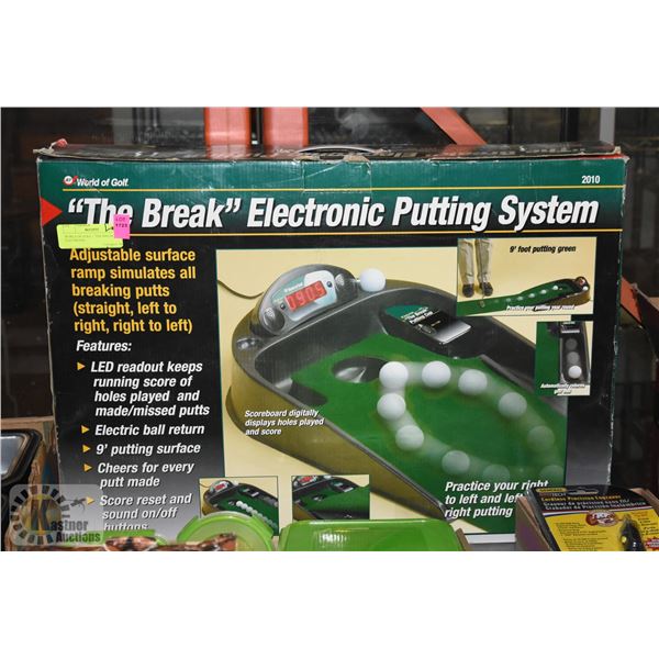 PUTTING SYSTEM - 9 FOOT PUTTING GREEN, ADJUSTABLE SURFACE RAMP SIMULATES BREAKS, ELECTRIC BALL RETURN, LED READOUT KEEPS RUNNING SCORE, ETC. (WORKI