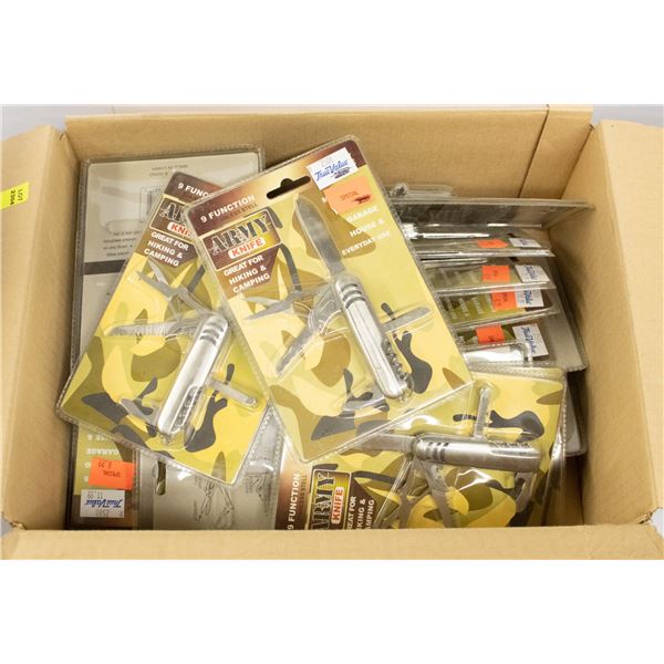 BOX OF OF 9 FUNCTION STAINLESS STEEL ARMY KNIVES