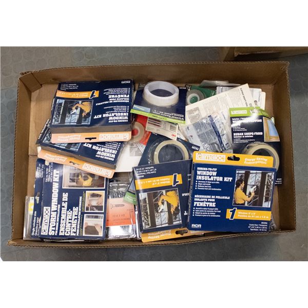 BOX LOT OF TAPE, CLIMALOC STORM WINDOW KITS,