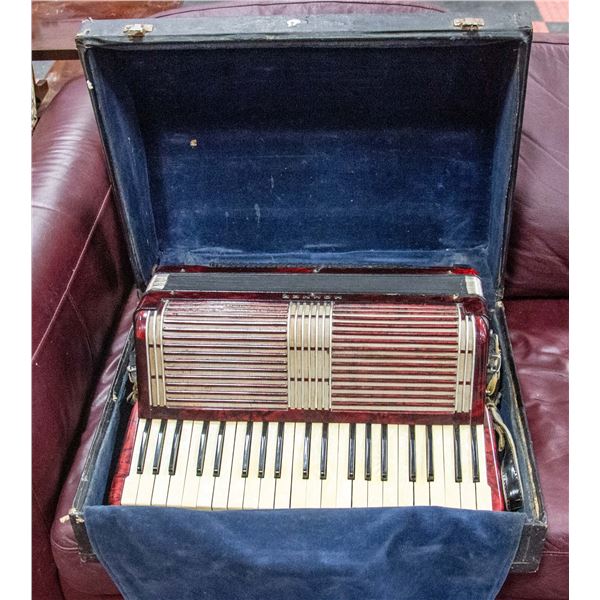 CASE - 120 BASE WORKING INSTRUMENT, RED, BLACK & IVORY, ART DECO LOOK, STRAPS WITH ORIGINAL HARD CASE.