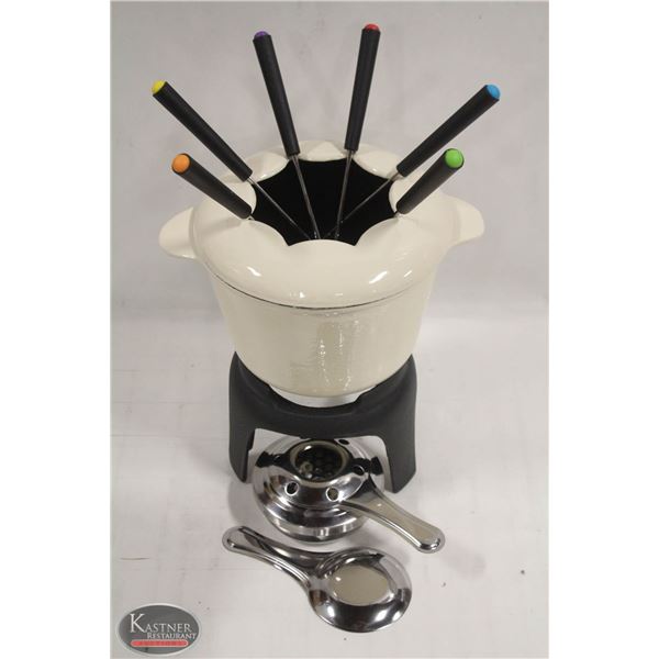 NEW IN BOX ENAMELED CAST IRON COMPLETE FONDUE SET