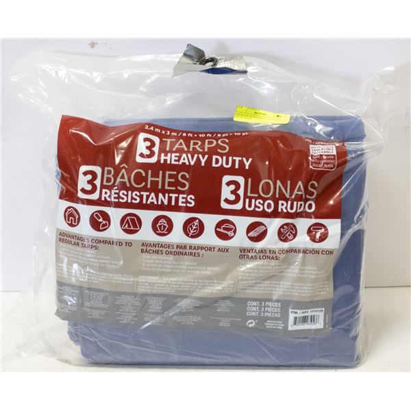 NEW PACKAGE WITH 3 X 8' X 10' HEAVY DUTY TARPS