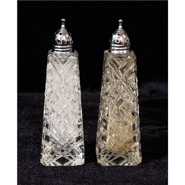 CUT GLASS SALT + PEPPER SHAKERS 5" TALL