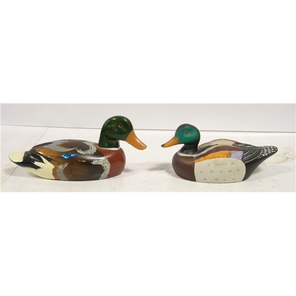 PAIR OF DECOR DUCKS - HANDCARVED WOOD + CERAMIC