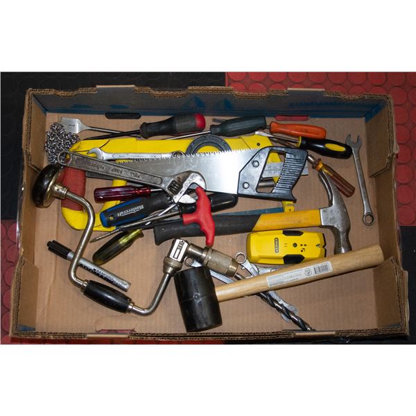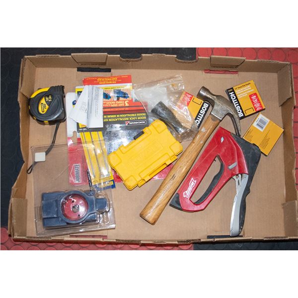FLAT OF ASSORTED HANDTOOLS, HARDWARE ETC