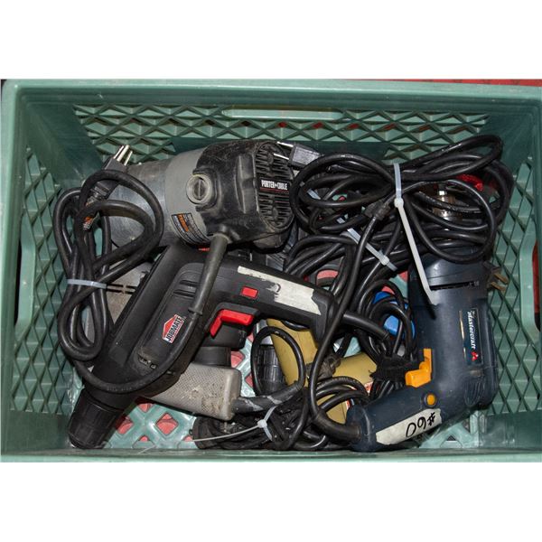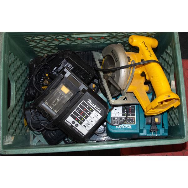 CRATE OF VARIOUS CHARGERS & POWER TOOLS