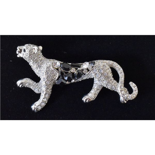 SILVER CHEETAH BROOCH WITH BLACK AND WHITE STONES