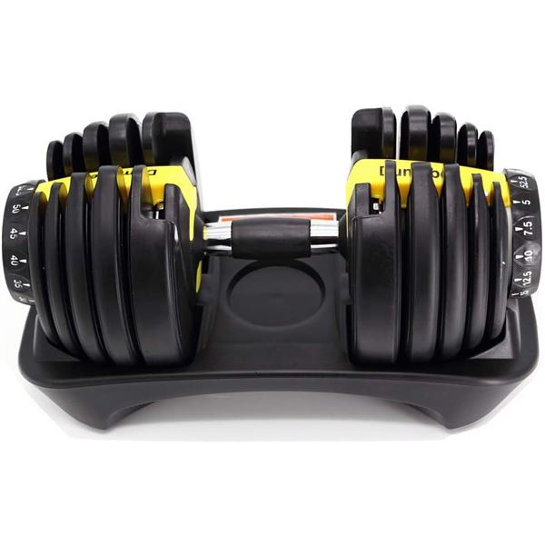 SET WITH EASY WEIGHT ADJUSTMENT FROM 5LBS - 52.5LBS, MADE BY OGODU, SINGLE DUMBBELL WITH STORAGE BASE, CHECKED, SEALED, COMES WITH CLOTH AND MANUAL