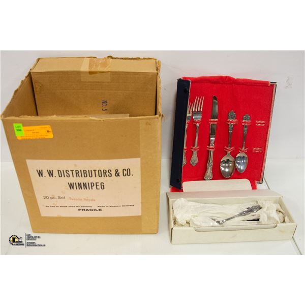 BOX OF ESTATE SILVERWARE + DISHWARE IN THE BOXES