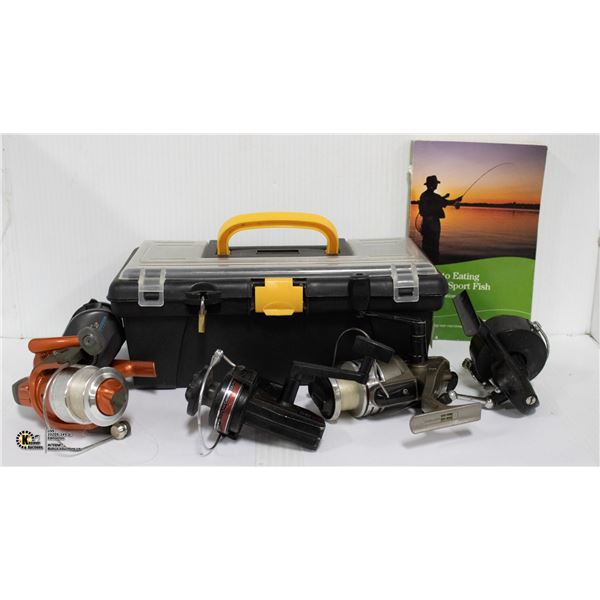 FISHING REELS & TACKLE IN BOX