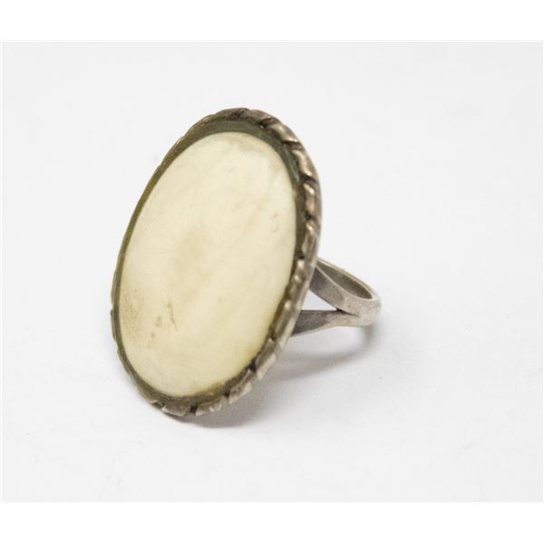 SILVER RING WITH WHITE OVAL INSET DETAIL