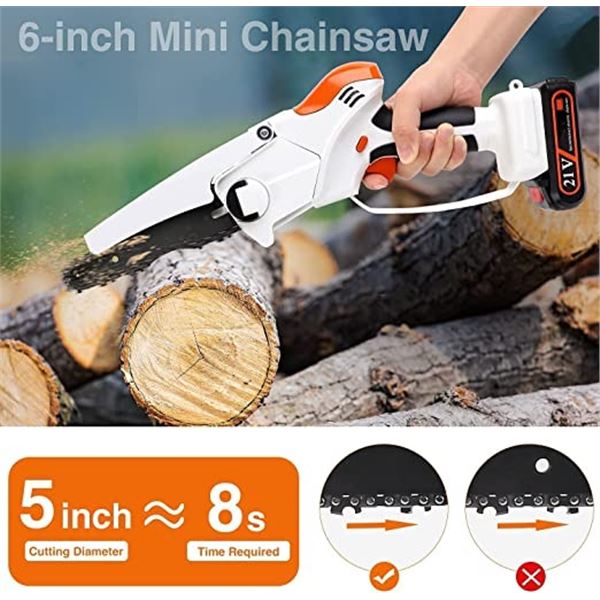 6 INCH MINI CHAINSAW, MODEL C200, WHITE, COMES WITH CARRYING/STORAGE BAG, GLOVES, EXTRA CHAIN, HAND GUARD, 2 RECHARGEABLE 21V LITHIUM ION BATTERIES