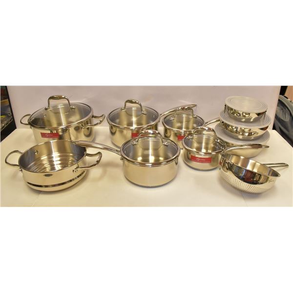 COOKWARE SET WITH LIDS, INDUCTION READY, LAGOSEAL PLUS BASE, FAST HEAT TRANSFER, 18/10 STAINLESS STEEL, HBC SES, MSRP $900