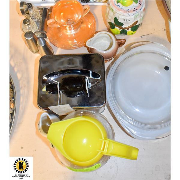 MUSHROOM CREAMER, BLACK PIR BIRD, FRUIT TEA CANNISTER, FIRE KING SUGAR AND SAUCER AND MORE.
