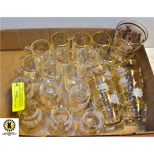 WHEAT GLASSES, 2 MID CENTRY GILT PINE CONE GLASSES, 6 FLORAL GLASSES WIRTH GILT BOWS, AND 10 TURKISH COFFEE/ESPRRESSO CUPS.